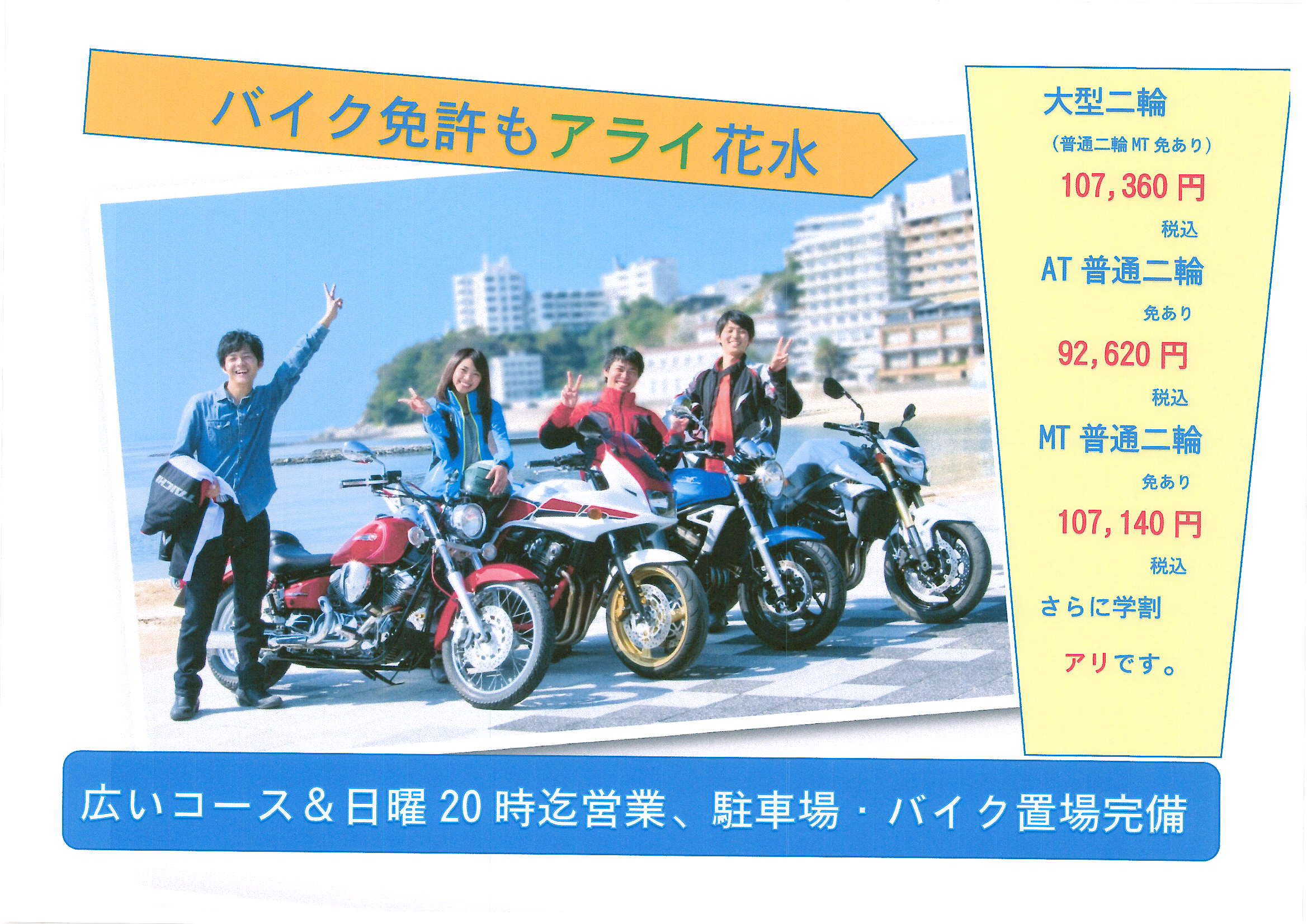 現在、大型二輪教習については普通二輪免許をお持ちの方に限り入校を受付致しております。