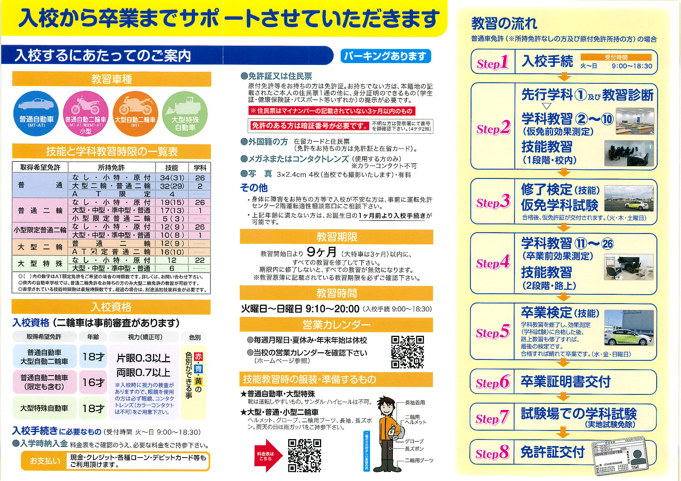 身体に障害のある方、免許の取り消し、無免許運転等の処分前歴のある方は、入校の手続きの前に係の者にご相談下さい。